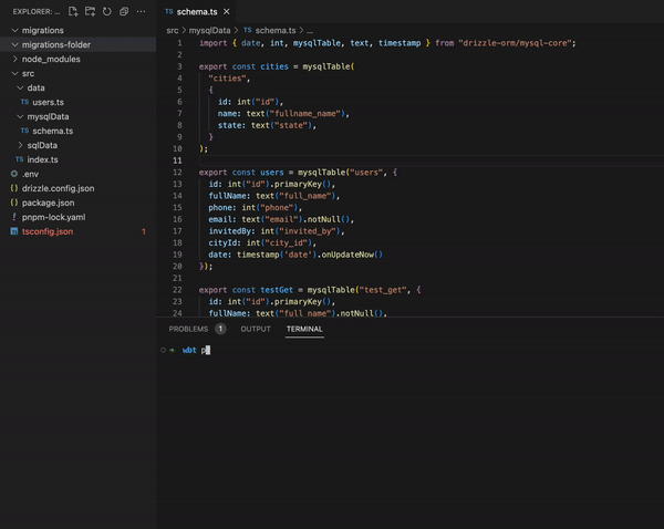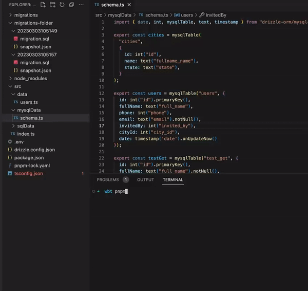 $ drizzle-kit generate:pg$ drizzle-kit generate:mysql$ drizzle-kit generate:sqlite// drizzle.config.ts